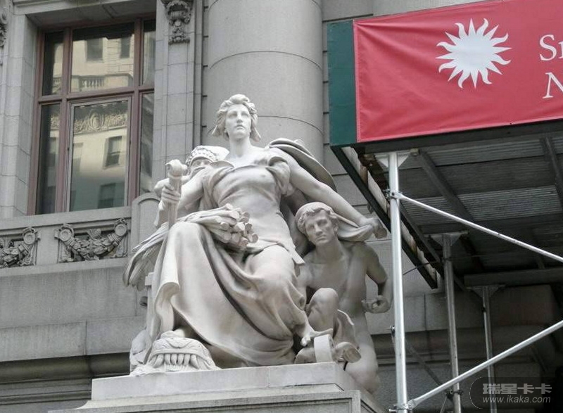 自由女神穿着古希腊风格的服装,右手高举象征自由的火炬,左手捧着刻有
