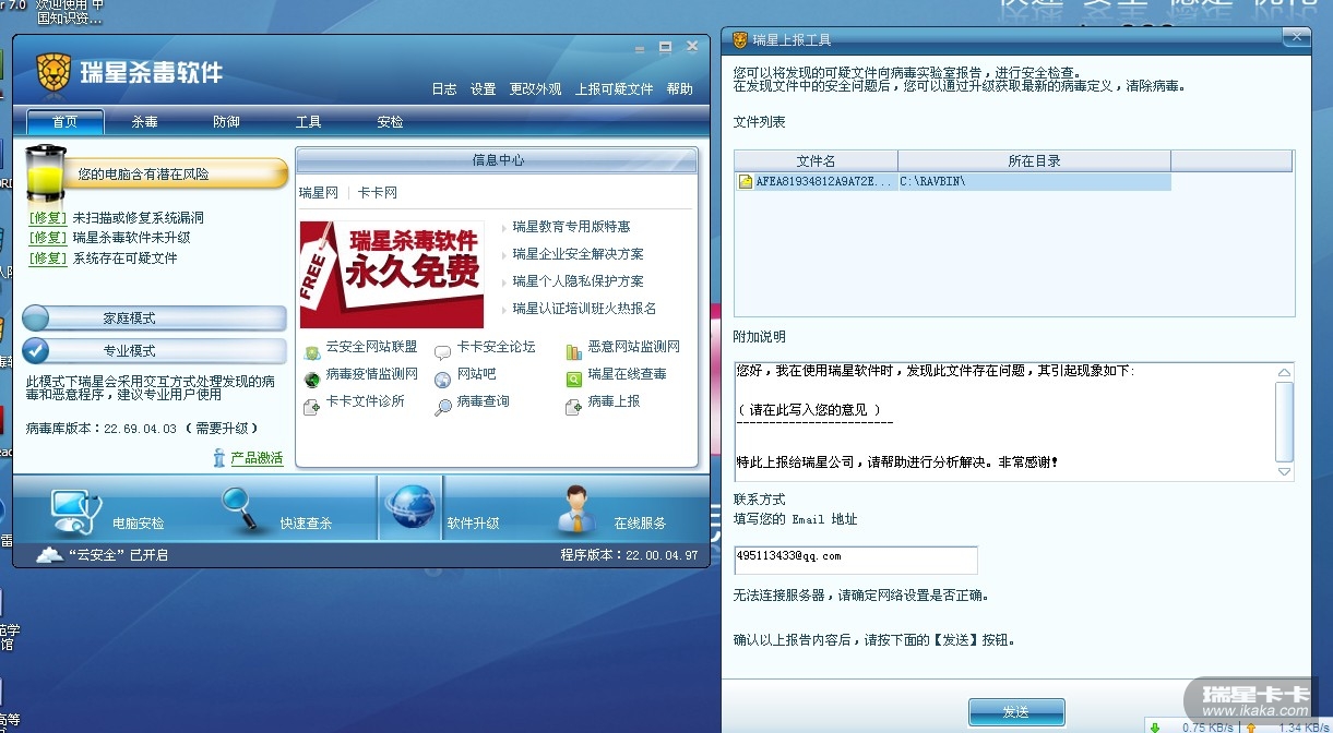 2012版杀毒软件在连接云的状态下,会将查杀过程中的可疑文件自动上报。并且会提示您发现可疑文件。