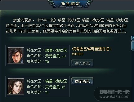 您需要在申请个瑞星账号,把71级的号绑定到新账号上去。点击绑定角色进行绑定。绑定后,老账号登录进入的79级的账号,新申请的账号登录进入71级别的角色。