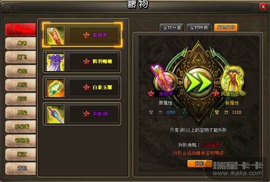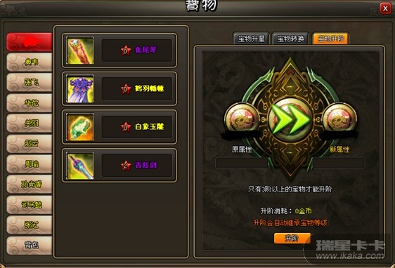 的宝物才能升阶,这时宝物会出现在左边的框中,并可在右边的框中预览升阶后的宝物。