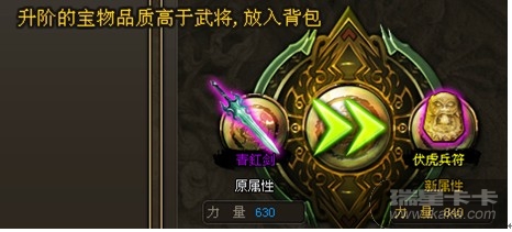 如果低品质的武将佩戴的宝物通过升阶提升了宝物的品质,则升阶成功后,则会自动的将宝物卸下放入背包中。