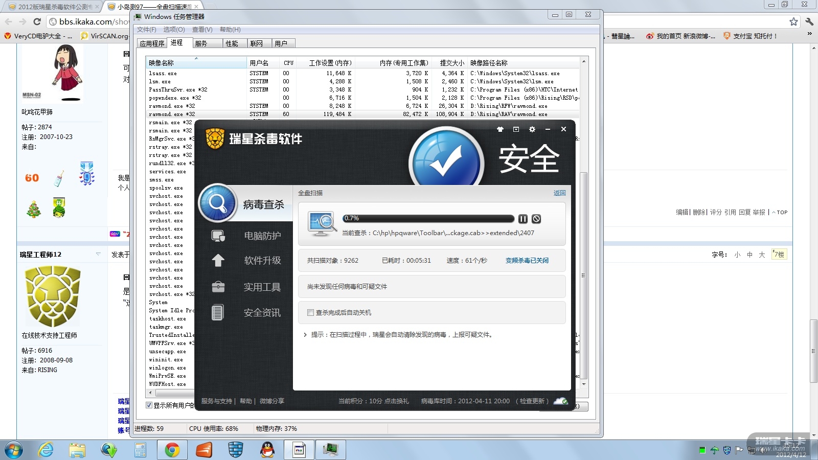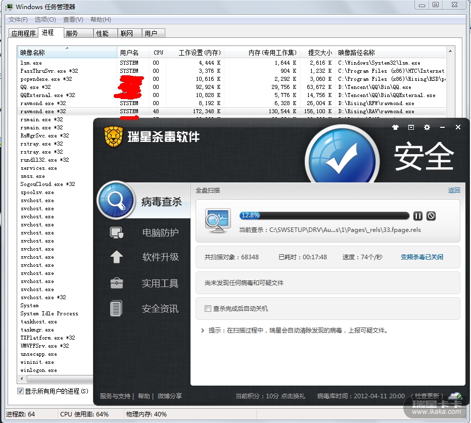 第一次全盘杀毒对内存的占用成波浪形上升,如文件够多,我有理由认为ravmond.exe内存的占用会撑满所有内存。