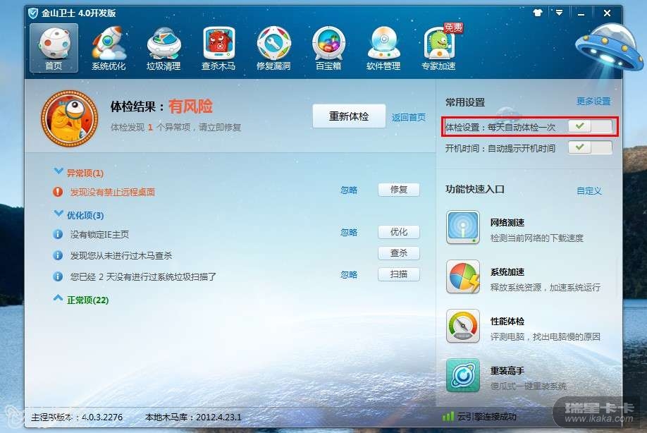 在测试瑞星的时候,看到了金山4.0的界面,希望学习它的界面设计,瑞星界面也弄成它这个样子的才好看,有点立体的感觉,这样看起来很新颖。(如图所示)