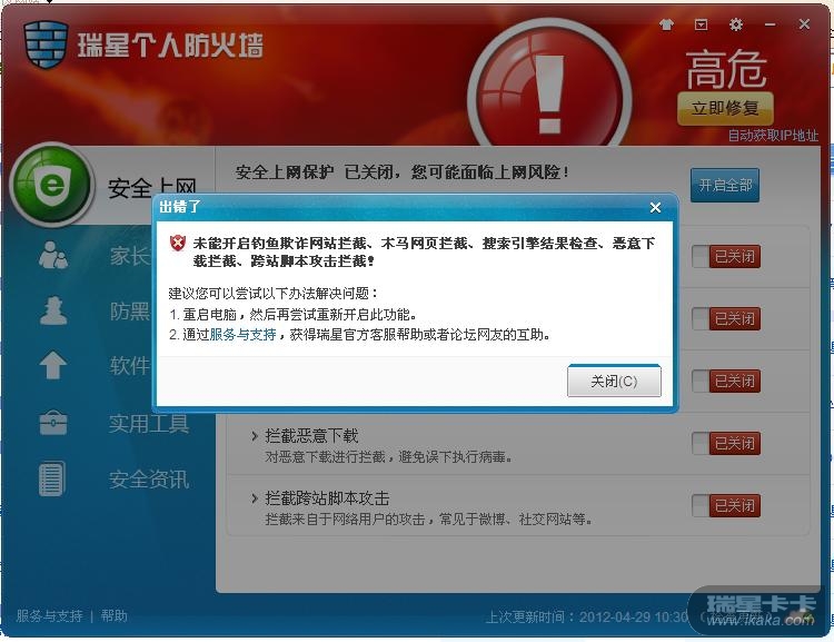 防火墙安全上网保护无法开启,修复再重启也不行,怎么办,瑞星杀软没报毒