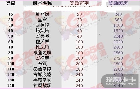 备注:奖励声望、阅历一览表