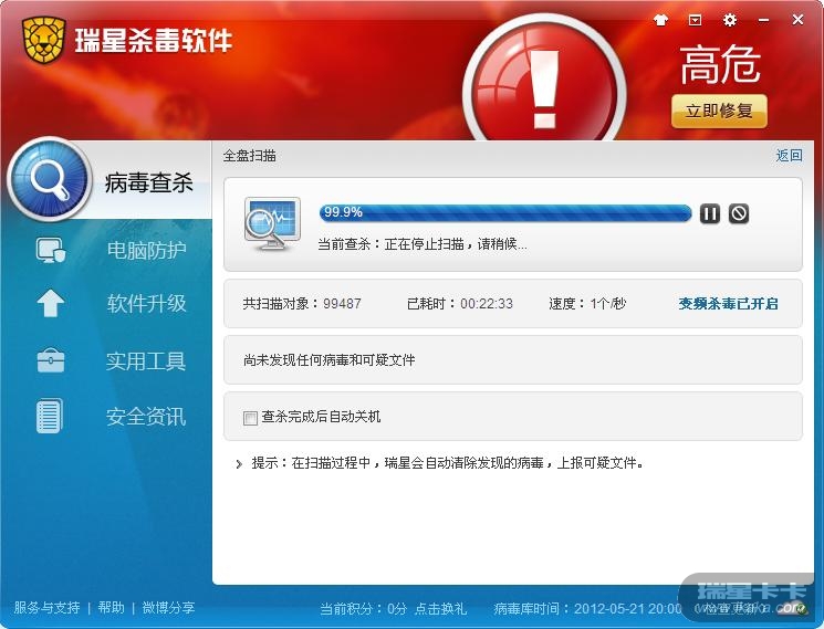 然后用瑞星扫描 相关 文件夹和内存 ,瑞星就找不着北了