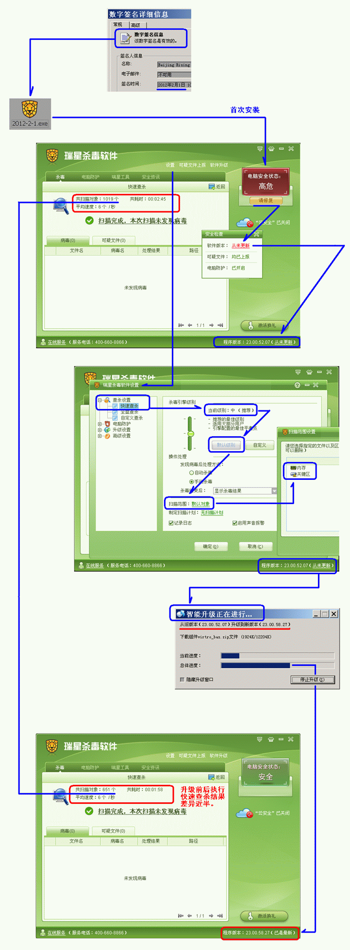为了进一步确认问题责任,我们检索了资料库,恰巧找到一个贵公司今年二月发布的离线安装包副本。于是将其在一台视窗 2k 机器上安装后随即执行 “快速查杀” 功能并记录结果,再联机升级至当时最新版随即执行 “快速查杀” 并比对升级前后的查杀结果(屏幕截图附后),发现第一贴反馈的问题得到再现。
