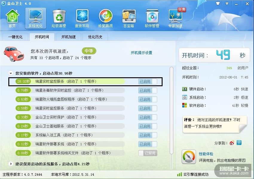 你看看 瑞星的启动项 占用了多少时间?