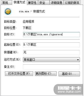 然后在快捷方式的那个(rsa.exe - 快捷方式)右键-属性-目标 后面加一个/ignoreos 记住/前面要空格