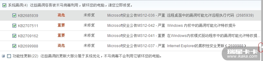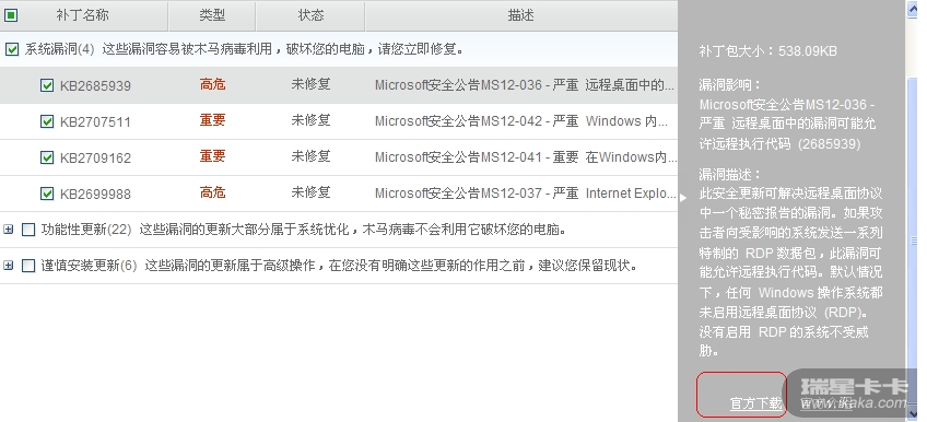 今天瑞星卡卡升级后扫除4个需要更新的补丁,前三个顺利更新了,但唯独这个一直是更新失败,请问这是怎么回事?这是高危补丁啊,为什么还能更新失败?