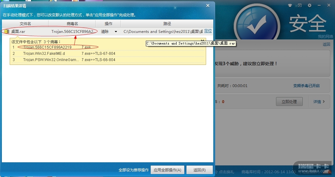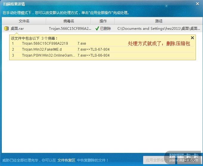 14、当压缩包内存在病毒名为“Trojan.一堆数字和字母”的病毒时,处理时会直接删除压缩包文件,而不是进入压缩包杀毒,建议改进。