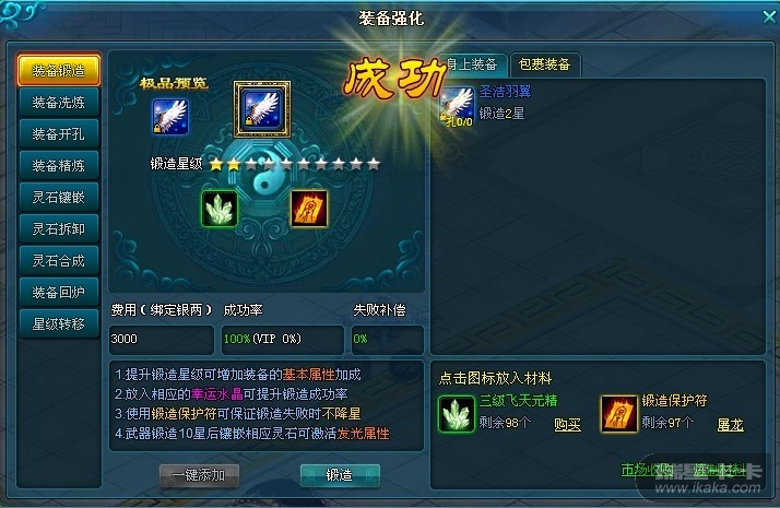 1、翅膀可在装备强化界面进行强化,初始星级为0,最高可锻造为10星,每级强化消耗绑定银两、消耗道具飞天元精