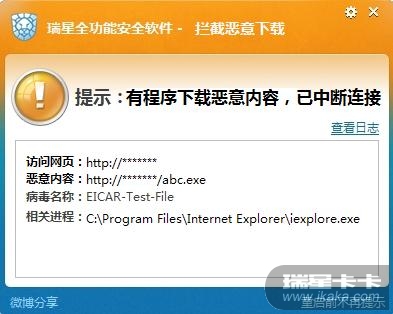 建议在程序、浏览器下载文件或加载网页时,发现病毒,瑞星应该中断连接(在有瑞星防火墙或直接是瑞星全功能安全软件的情况下)并提示。
