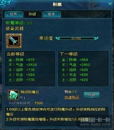 提升附魔等级需要消耗道具附魔石以及绑定银两,绑定银两不足时消耗非绑定银两,不同等级消耗的数量也不同;3、