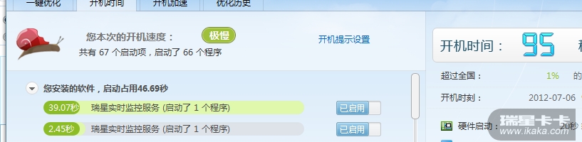 开机时间达到了95秒,如图瑞星实时监控服务就用去了39秒,这也太慢了吧。