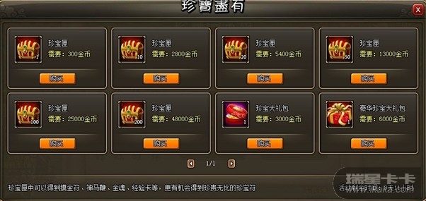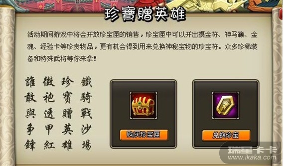 活动内容:活动时间内玩家可以使用礼券或金币在活动界面购买珍宝匣,使用珍宝匣以后有几率获得摸金符、神马鞭、金魂、经验卡、珍宝符、银币等!活动时间仅有x天,错过机会不再,赶快行动起来,江山美人尽如怀中!