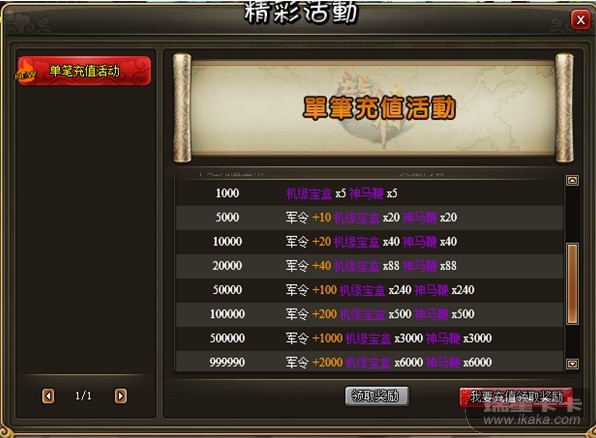 活动二: 单笔充值活动单笔充值活动开始啦!我们为您准备了丰厚的特供大礼包,不限量放送,只要你达到条件,礼包马上拿到手!走过路过千万不要错过!