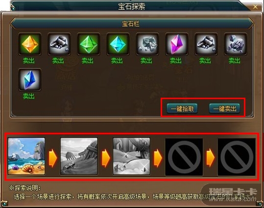 (3)探索获得的宝石会显示在宝石栏,玩家可以适当使用“一键拾取”和“一键卖出”简化操作。