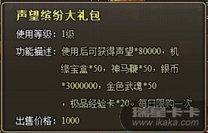 声望缤纷大礼包:使用后可获得声望*80000,机缘宝盒*50,神马鞭*50,银币*3000000,金色武魂*50,极品经验卡*20