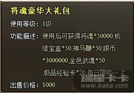 将魂豪华大礼包:使用后可获得将魂*50000,机缘宝盒*50,神马鞭*50,银币*3000000,金色武魂*50,极品经验卡*20