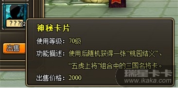 使用神秘锦囊或者缤纷锦囊,分别可以获得“神秘卡片”和“缤纷卡片”。使用神秘卡片后可随机获得一张“桃园结义”、“五虎上将”组合中的三国名将卡。