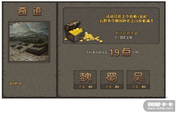 活动奖励:奇迹建成奖励为国家宝箱,国家宝箱可以开出银币、玉石、威望、军令和攻击令。