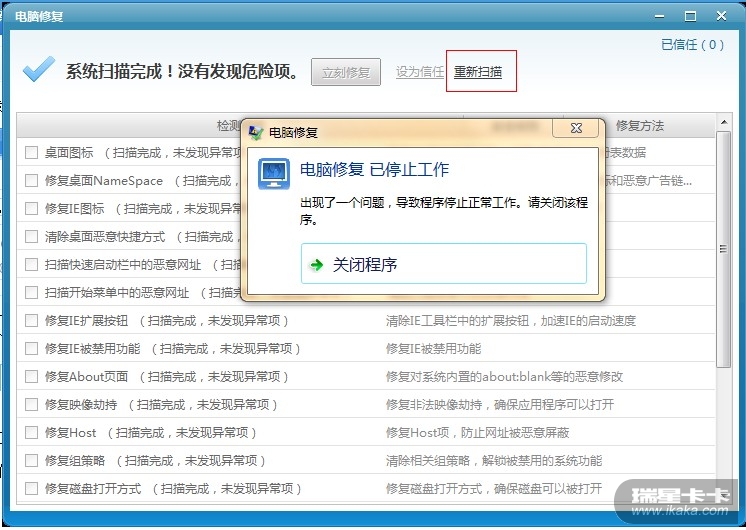目前就“电脑修复”这个小工具发现一个BUG,就是不断的快速点击“重新扫描”和“停止扫描”按钮,程序就死了,反复测试都存在这种情况,我的测试环境是WIN7 32位,下面附图和dmp文件。