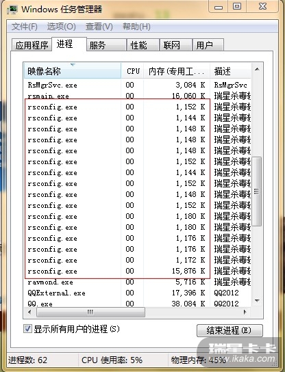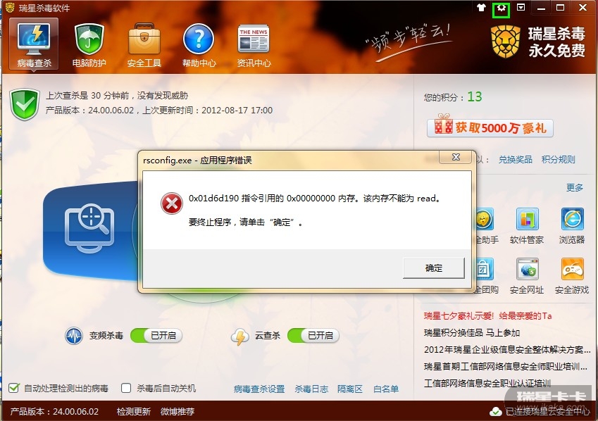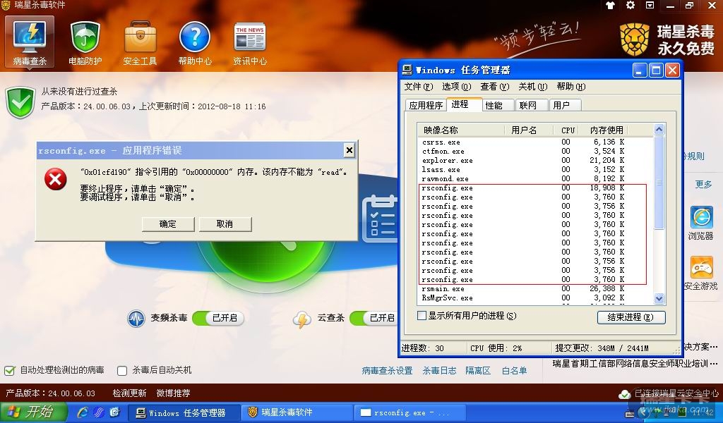 测试方法很简单,在主界面反复点击设置按钮(见图),瑞星就会不断加载设置程序(rsconfig.exe),在进程中你点几下设置按钮就会出几个进程,虽然最后只会弹出一个设置窗口,但经常会出错(见图),出错后rsconfig.exe就不会自己结束了,要将瑞星主界面关掉,上述进程才会消失,希望在只允许程序运行一个实例运行方面再完善下,包括日志按钮也是一样,点几个就出几个进程。附上dump文件。