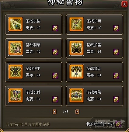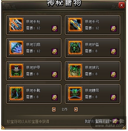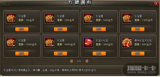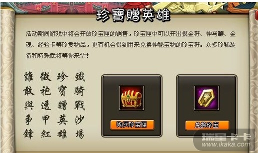 活动二:兑换珍宝活动活动时间:2012年8月28日0:00-8月31日23:59活动内容:活动时间内玩家可以使用礼券或金币在活动界面购买珍宝匣,使用珍宝匣以后有几率获得机缘宝盒、神马鞭、金魂、经验卡、珍宝符、银币等!活动时间仅有x天,错过机会不再,赶快行动起来,江山美人尽如怀中!注:活动期间所有珍宝只能兑换一次,已经兑换过的奖励将无法再次进行兑换。珍宝匣购买没有限制。活动首界面: