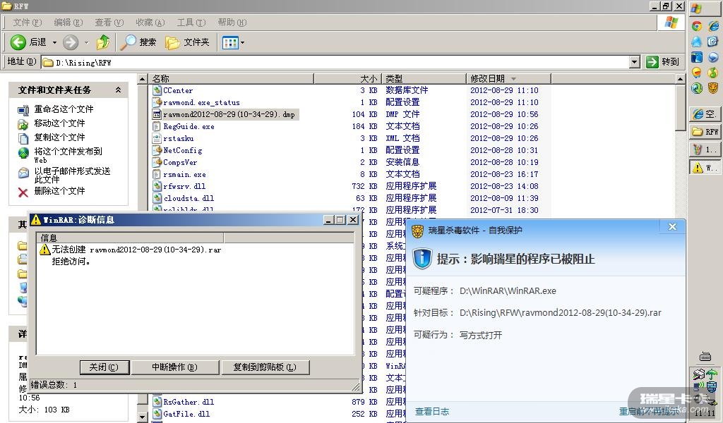 如图,RFW进程出错,在压缩处理DMP文件时RAV的策略阻止了,要删除先前压缩的RAR时也触发了保护
