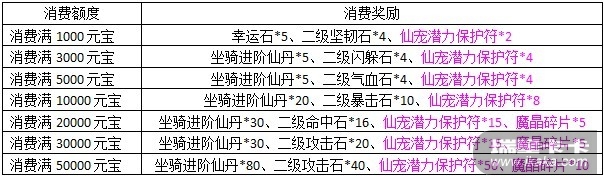 活动期间,玩家通过商城、仙境寻宝、神秘商店及吉祥道场消费至指定额度,可获得额外的奖励。