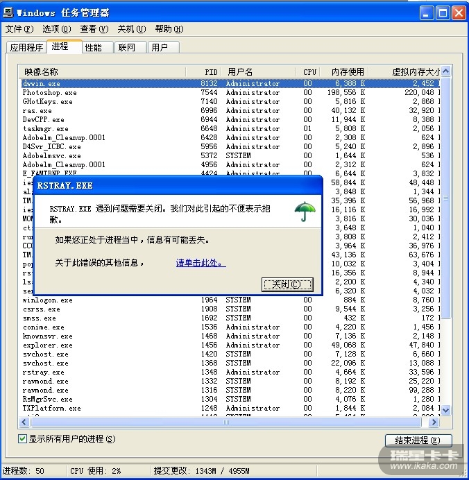 最近一段时间都会弹这个RSTRAY.exe遇到错误需要关闭.点关闭之后,右下角的伞没了.