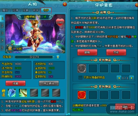 获得守护后可通过喂养守护之灵提高精灵守护的等阶,精灵守护激活后将直接增加人物属性。