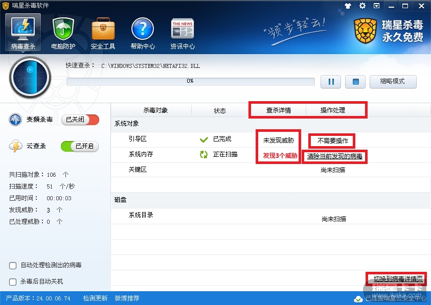查杀过程中应该给用户提供一个在查杀中途处理病毒的功能,如图