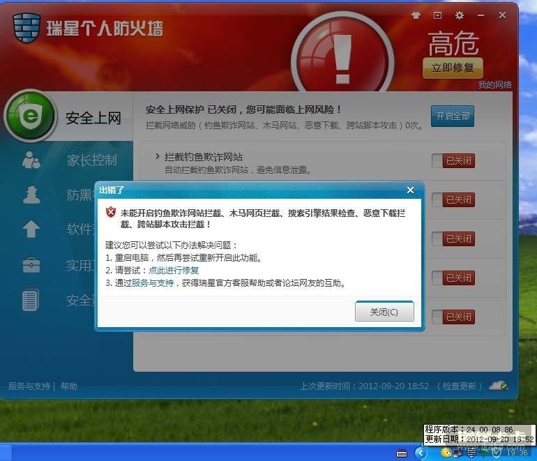 www.risng.com.cn下载最新版本安装包,重新安装一下,确定没有其他安全软件把瑞星优化了,安装瑞星的时候,相关驱动也都放过不能拦截。