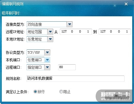 我有个程序需要访问本机80端口,并且禁止它访问其它地址,应该怎样设定自定义规则?