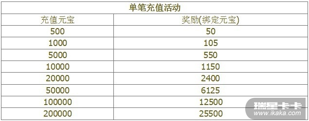 注意:单笔充值只计算最大值,比如玩家充值150000元宝,则获得100000元宝档次的的返利