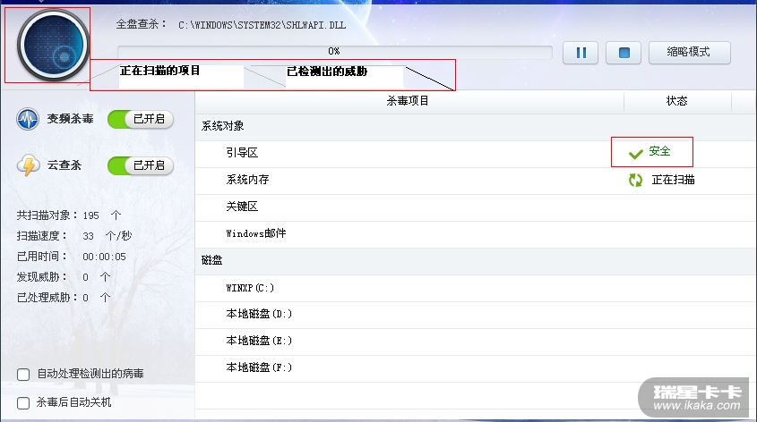 1.新版v16的病毒查杀中,在扫描时无法查看已发现的威胁信息,只有等扫描完成之后才会统一显示,感觉这种设计不够人性化,建议另开两个标签按钮;2.把状态中的√“已完成”改为安全,如果发现威胁,则显示ד风险”;3.将扫描进度条左边的动态图标更换为缩略模式下左方的图标(个人感觉中间添加logo更美观些)4.扫描暂停状态下,进度条左边的动态图标应该停止波动 以上建议见下图: