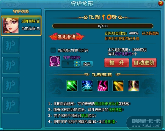 每个守护都有各自化形阶数,化形总共有10阶,升阶需消耗守护化形丹