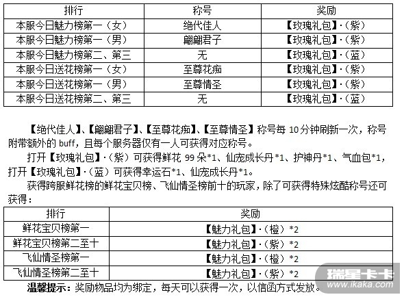 每日烟花晚会(20:30-21:00)期间,每3分钟会全服抽取一条玩家的幸运表白,被抽中的表白者将会获得蓝色妖姬*1、三生石*88的奖励,被表白的玩家也将会获得蓝色妖姬*1、【玫瑰礼包】•(紫)。