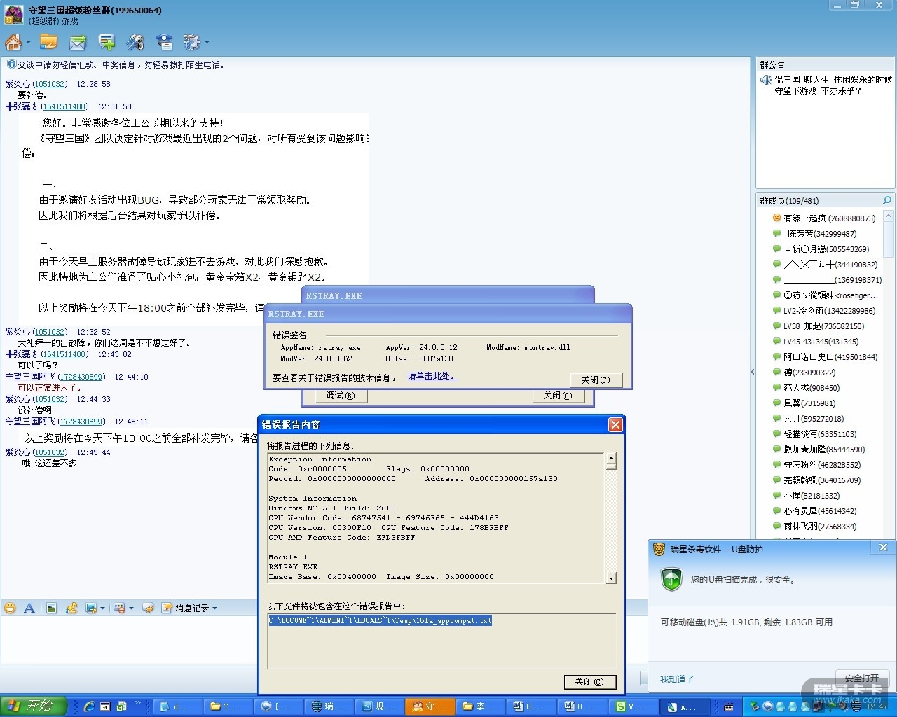 插上U盘,然后弹出U盘扫描的提示,然后系统卡住.几分钟后弹出RSTRAY崩溃.