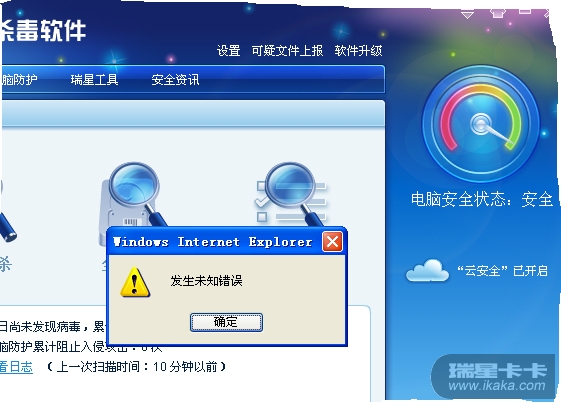 如题我的瑞星2011杀毒不能使用,在不联网的情况想点击瑞星,就会出现出现未知错误对话框,点击确定就会退出,联网就没有什么问题
