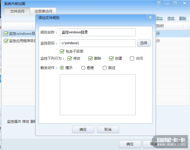 在“文件访问”规则设置监控windows目录及各级子目录: