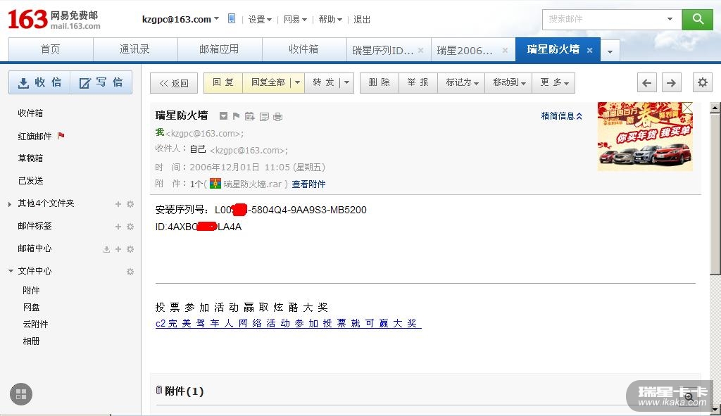 我是2003年在单位接触的瑞星,2005年单位开始用“瑞星中小企业版”统一管理着分布在各站的电脑,感觉不错,2006年单位领导买了单机版的瑞星产品,因为单位安装了监控,可以远程看到我在电脑上的操作,感觉不方便,于是我将领导的三个序列号抄下来[发到自己的电脑专门邮箱里(注:我将电脑有用的都发到自己邮箱里)],安装到我的电脑上,这是邮箱的截图,