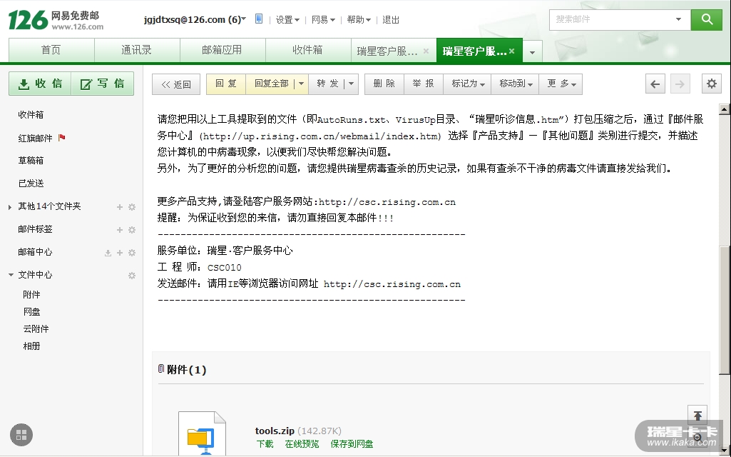 由于不在单位的“瑞星中小企业版”保护,同事家的孩子到我的机器上玩,结果中招了,于是在2007年3开始求助瑞星工程师,并得到了圆满解决。这个邮箱是单位的邮箱。