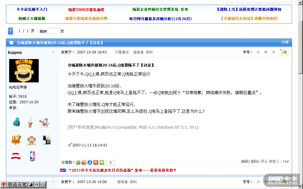 1、2011年2月参加“新春送礼,福兔踢楼”活动中,获得了200楼的奖励:瑞星全功能安全软件(RIS)一年版序列号一个