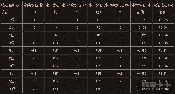 【魂石等级属性对照表】