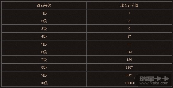 不同等级的魂石的评分不一样,其中1级魂石最多只能提升1点评分,但是10级魂石提升19683点评分。
