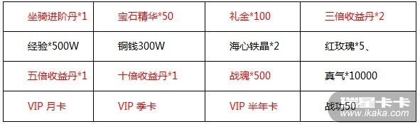 Ø 充值活动三:活动期间内,每次充值满2000元宝,均可免费领取以下道具: