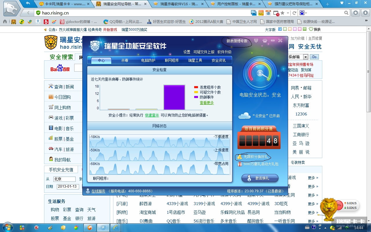 点击新浪微博专版可以进入新浪微博,积分换礼改成或添加为瑞星安全网址、游戏、网购